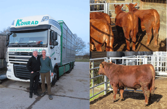 - - - March 2015 - Export to Poland On March 9 Slawomir Gromulski, a leading Red Angus breeder from Poland collected a consignment of 4 heifers and a bull (Hawkley Red Envoy P675) for the journey to their farm east of Warsaw.