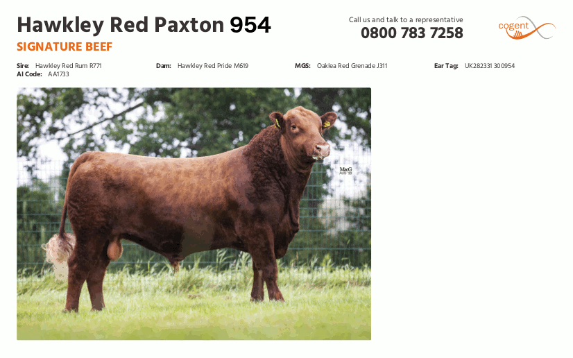 - - January 2013 - Two Hawkley bulls selected by COGENT Hawkley Red Zeus L575 and Hawkley Red Zhivago M598 have been sold to Cogent Breeding Ltd for semen collection. These are the first Red Angus bulls Cogent have bought, and semen will be used to fulfil export orders as well as supplying the home market.
